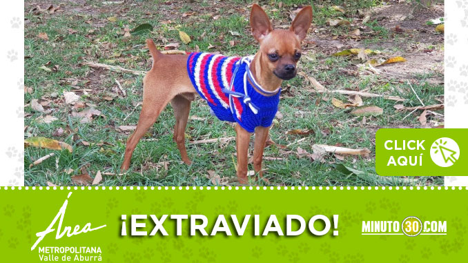 Este perrito que obedece al nombre de ‘Otto’ se perdió en Sabaneta, lleva su suéter azul puesto.