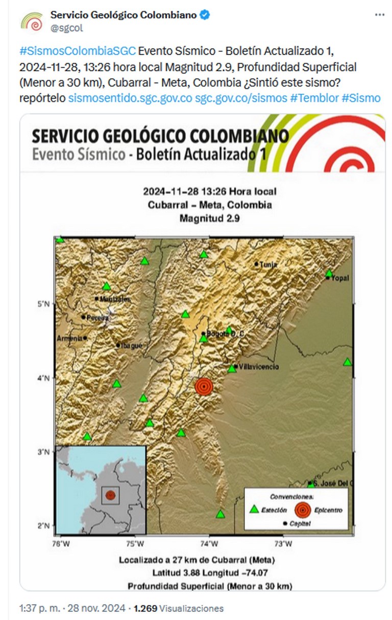 Su epicentro fue localizado en el municipio de Cubarral, en el departamento del Meta.