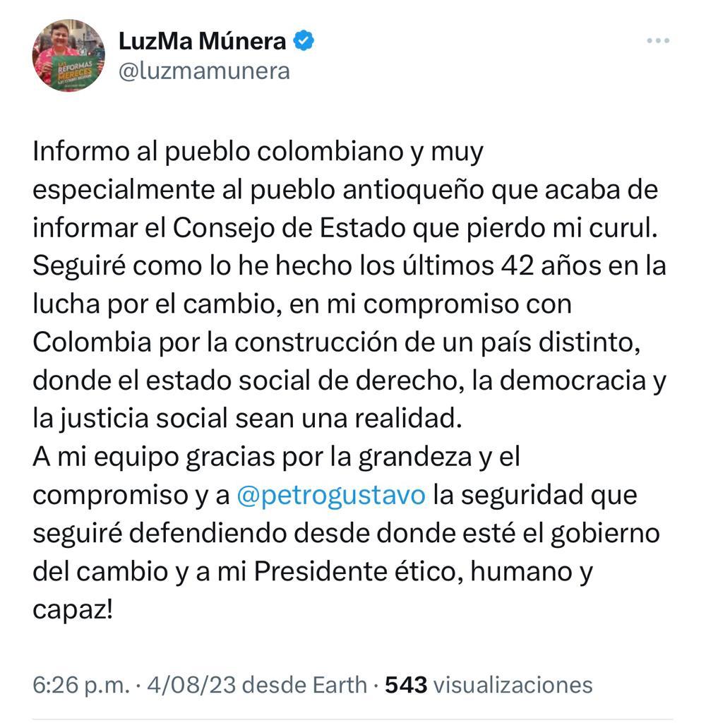 “Informo al pueblo colombiano y muy especialmente al pueblo antioqueño que acaba de informar el Consejo de Estado que pierdo mi curul. Seguiré como lo he hecho los últimos 42 años en la lucha por el cambio, en mi compromiso con Colombia por la construcción de un país distinto, donde el estado social de derecho, la democracia y la justicia social sean una realidad. A mi equipo gracias por la grandeza y el compromiso y a @petrogustavo la seguridad que seguiré defendiendo desde donde esté el gobierno del cambio y a mi Presidente ético, humano y capaz!”, escribió.