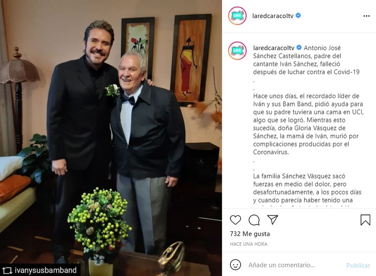 El programa La Red de Caracol Televisión, afirmó que el papá del líder de Iván y sus Bam Band, Antonio José Sánchez, murió luego estar varios días en una Unidad de Cuidados Intensivos por cuenta del virus.