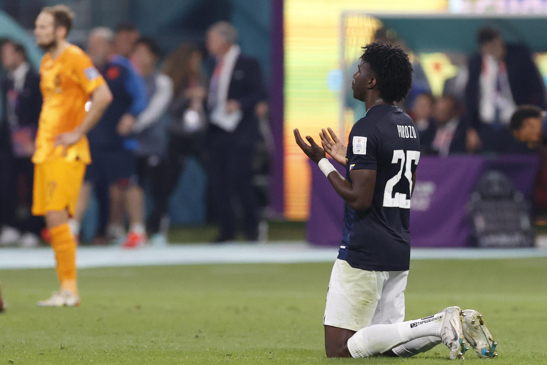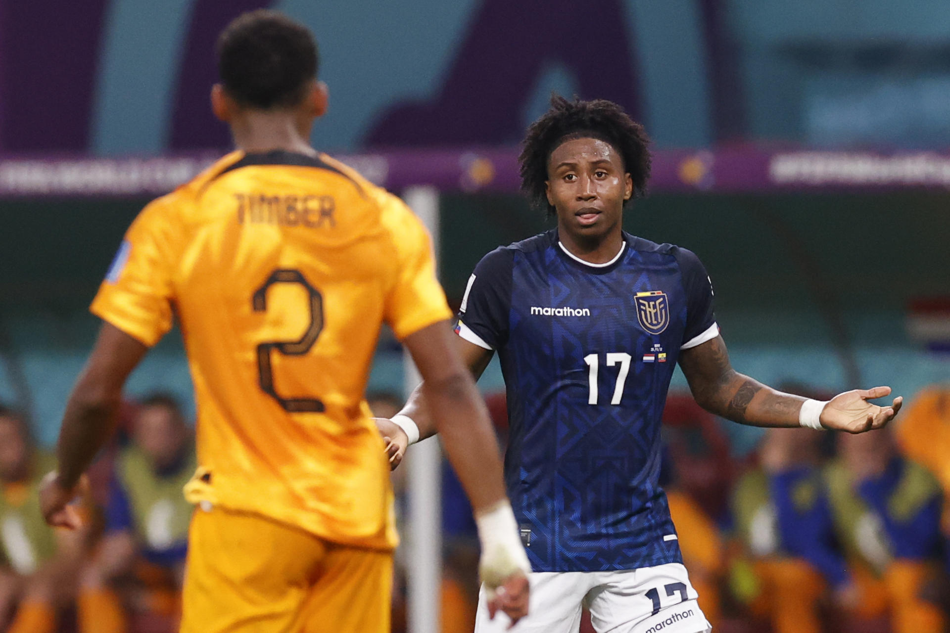 GR5008. DOHA (CATAR), 25/11/2022.- Angelo Preciado de Ecuador reacciona hoy, en un partido de la fase de grupos del Mundial de Fútbol Qatar 2022 entre Países Bajos y Ecuador en el estadio Internacional Jalifa en Doha (Catar). EFE/ Esteban Biba