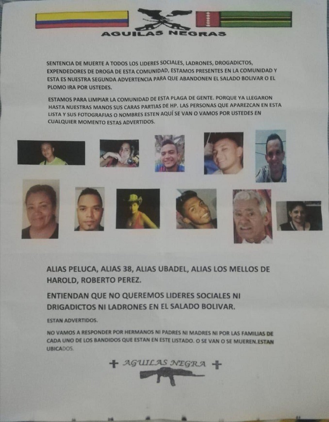 En el papel aparecen 11 fotografías con los rostros de las personas amenazadas, y dice: “No queremos líderes sociales, ni drogadictos ni ladrones en El Salado, Bolívar”.