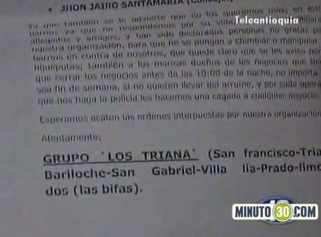 Minuto30.com .- El sur del Valle de Aburrá vuelve a estar bajo la sombra de “Los Triana de Itaguí”. Esto se evidencia tras las amenazas de la banda delincuencial al comercio y habitantes de 5 barrios de Itaguí y sectores de Medellín, al sur del Valle del Aburrá.