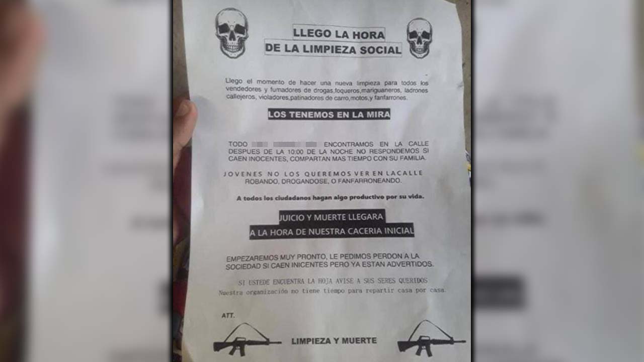 El documento que rueda de mano en mano no está firmado por ningún grupo armado y dice estar dirigido en contra de “vendedores y fumadores de droga, mariguaneros, ladrones, violadores, patinadores de carros, motos y fanfarrones” (sic).