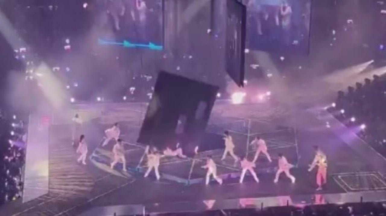 En el video se puede observas cuando la enorme pantalla que estaba suspendida sobre ellos se desenganchó y cayó sobre los chicos.