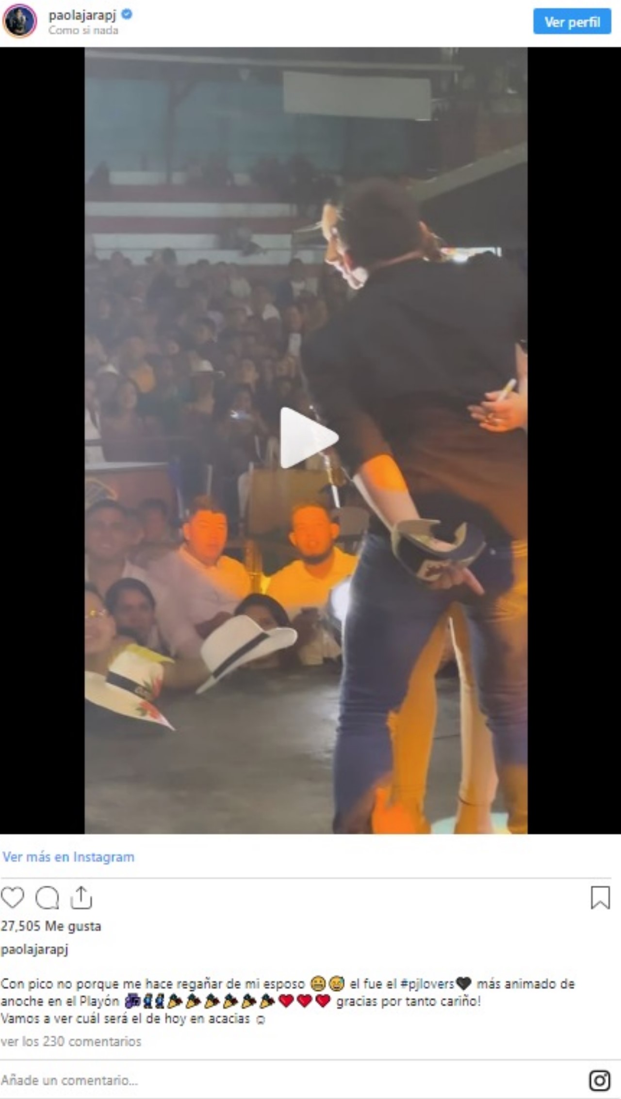 “Con pico no porque me hace regañar de mi esposo 😬😅 el fue el #pjlovers 🖤 más animado de anoche en el Playón 🎶🕺🕺🎉🎉🎉🎉🎉🎉❤️❤️❤️ gracias por tanto cariño!”, escribió Paola Jara en el post.