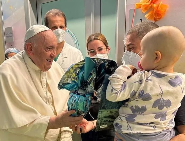 Como muestra de la gran mejora en salud que ha tenido el papa Francisco, este viernes 31 de marzo, realizó una visita al área de oncología pediátrica del hospital Gemelli de Roma, lugar al que ingresó por su cuadro de bronquitis, y terminó hasta bautizando a uno de los bebés de esta sala.