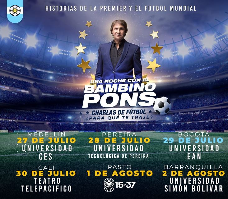 El ‘Bambino’ Pons estará de gira por Colombia, realizando ‘charlas de fútbol’ con el estilo único, de esos que a los amantes del fútbol, en especial de la Premier League, los engancha a la pantalla chica.