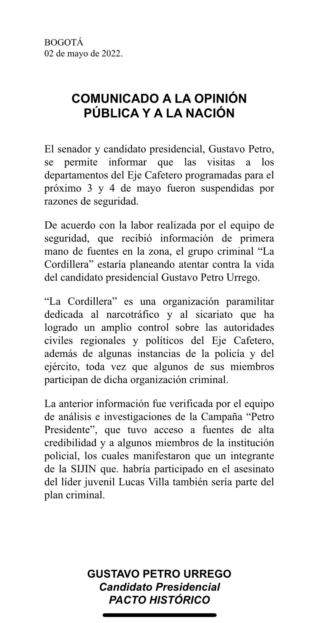 Por medio de un comunicado de prensa, el candidato presidencial Gustavo Petro confirmó que tuvo que cancelar su viaje al Eje Cafetero, pues habría una amenaza seria y se habla de que al parecer se planeaba un atentado en su contra.