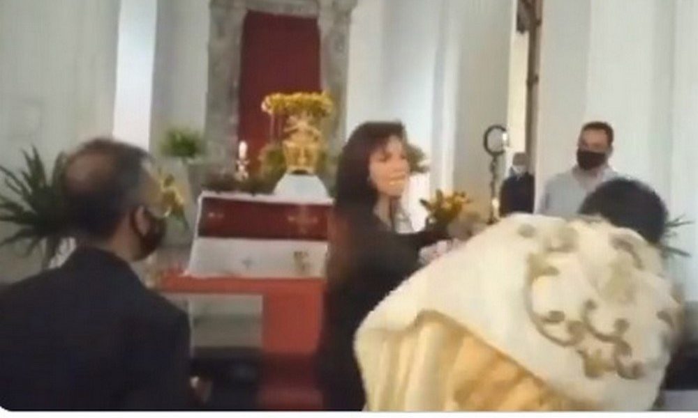En la grabación se ve cómo la mujer llega y ve al cura arrodillado rezando, una vez él levanta la cara lo cachetea. El incidente habría ocurrido el pasado jueves Santo minutos después de que terminará la eucaristía.