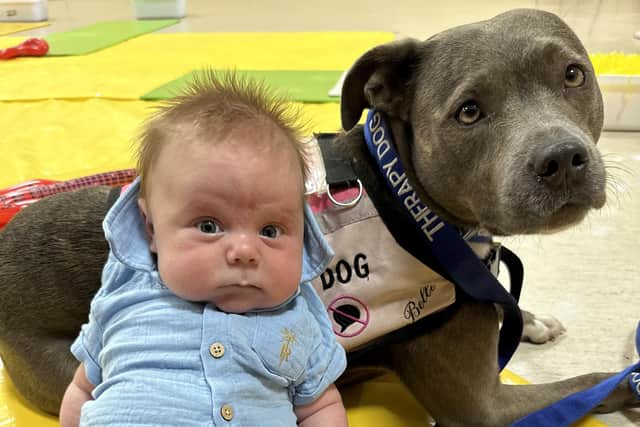 Esta preciosa perrita de raza Staffordshire Bull Terrier, de dos años, acompañó a Amee, su dueña, y una mamá de 33 años, durante las citas de todo su embarazo.