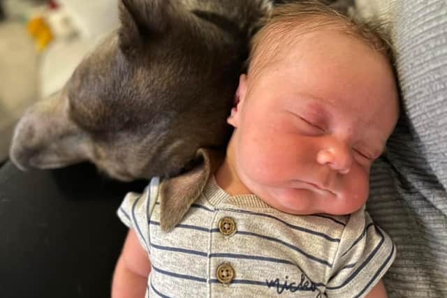 La perrita se comportó tan bien que el Hospital Universitario Milton Keynes, Bucks, le permitió a Amee quien estaba nerviosa, que su perrita entrara y la asistiera en la sala de maternidad antes de que tuviera una cesárea.