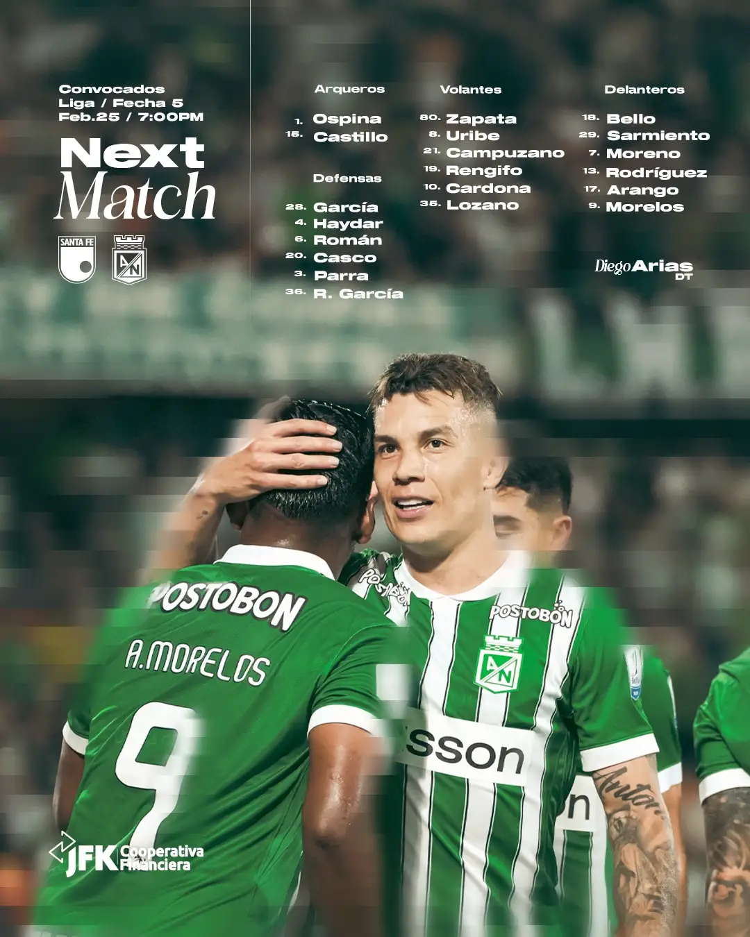 Resumen: Este miércoles 25 de febrero, Atlético Nacional, bajo la dirección de Diego Arias, buscará mantenerse en la cima de la Liga BetPlay al visitar a Independiente Santa Fe en el estadio El Campín a las 7:00 p. m. El encuentro tiene un matiz especial debido al enfrentamiento contra su extécnico, Pablo Repetto, para el cual el equipo antioqueño ha convocado a sus principales figuras, incluyendo referentes como David Ospina, Edwin Cardona y Matheus Uribe. Con una nómina ofensiva liderada por "Chicho" Arango y Alfredo Morelos, el "Rey de Copas" apunta a consolidar su gran momento en este cierre de jornada.