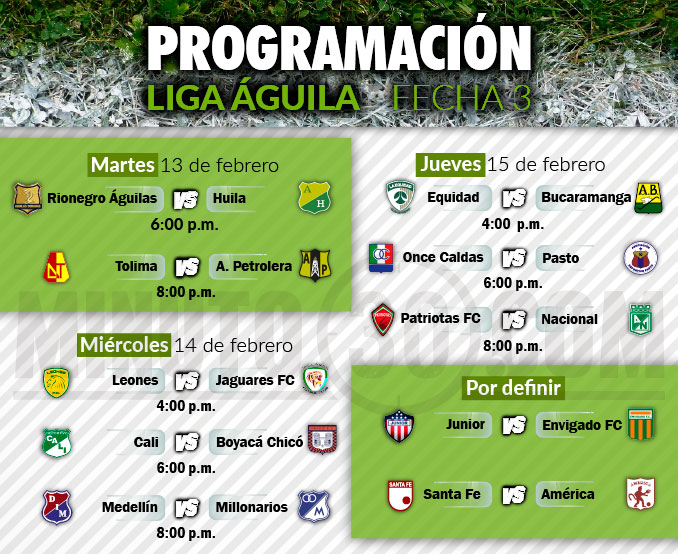Minuto30.com- En el transcurso de la próxima semana se cumplirá la fecha 3 de la Liga Águila I-2018, que se abrirá el martes 13 de febrero en el Estadio Alberto Grisales, con el partido entre Rionegro Águilas y Atlético Huila.