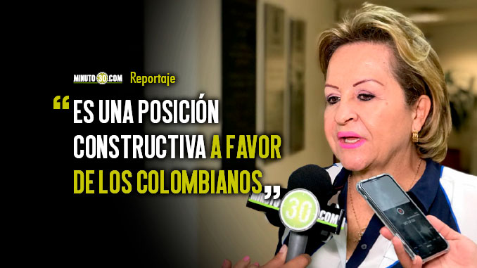 La concejal manifestó que apoya la decisión del Partido liberal, de la que dice que es una posición constructiva , de centro, que apoyará todo lo que sea conveniente para el país, pero que también hará un control político sobre los proyectos, los programas y las situaciones en los que el partido considere que no es conveniente y que su impacto es negativo.