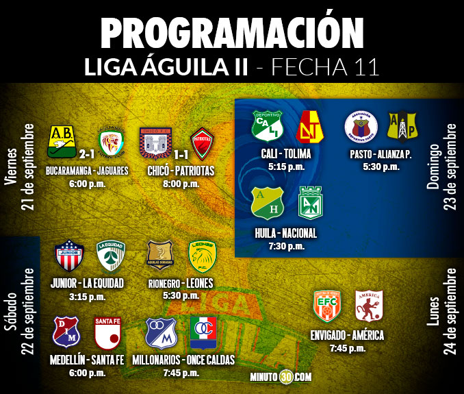 El domingo habrá tres partidos y el lunes 24 de septiembre cerrará la programación con el juego entre Envigado FC y América, que se medirán a las 7:45 p.m. en el Polideportivo Sur.