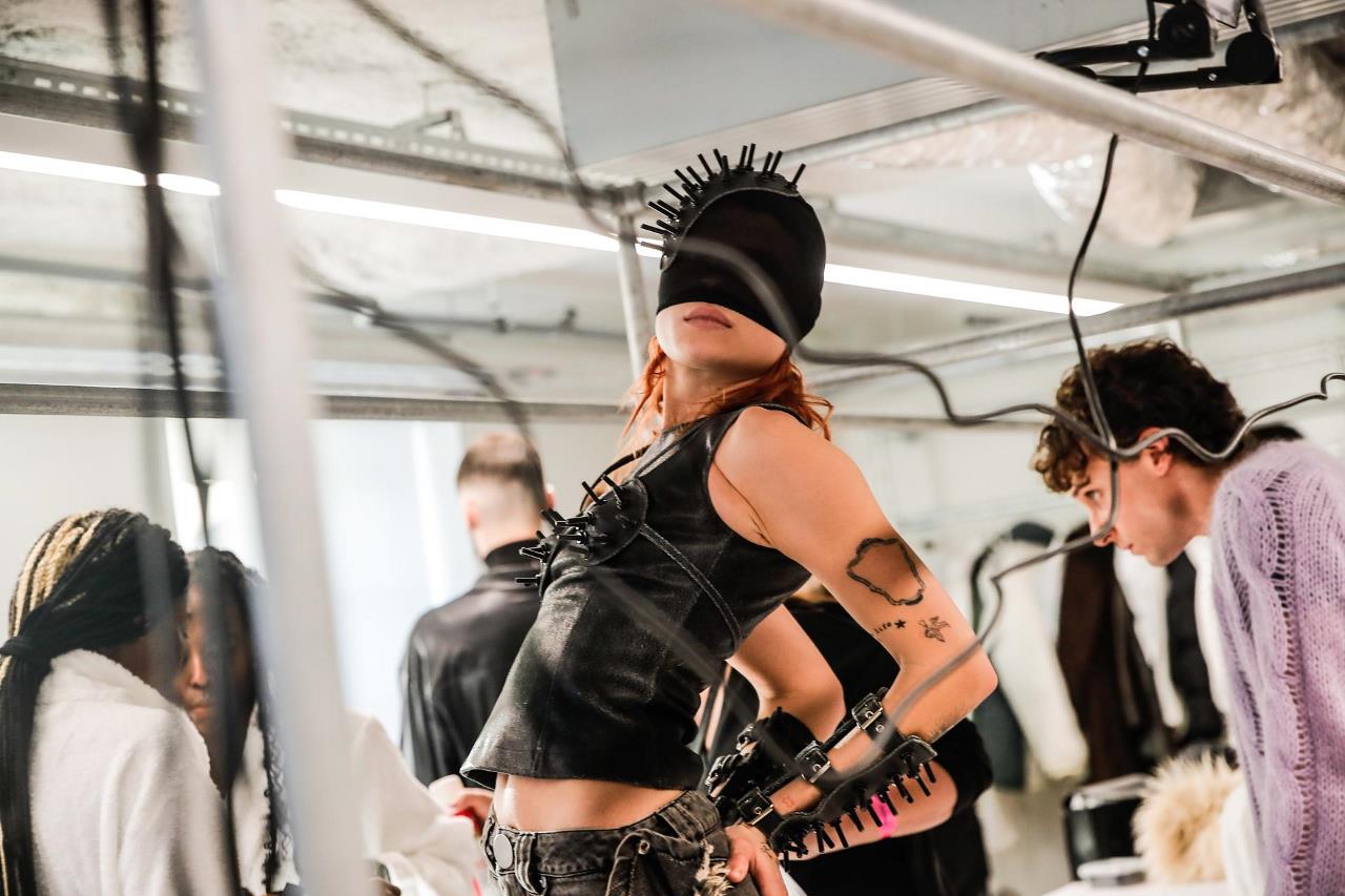 Bolsas de plástico a modo de vestidos, arneses de piel y argollas metálicas sobre un top básico y lencería superpuesta a faldas y pantalones, fueron algunas de las arriesgadas prendas que se vieron en la línea, cargada de referencias al sadomasoquismo.