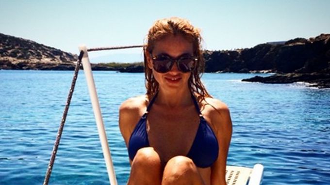 Las paradisíacas playas en las Islas griegas han sido testigos mudos del espectacular cuerpo que vuelve a presumir “la chica dorada” luciendo un diminuto bikini azul y gafas de sol mientras toma el sol con una amiga.