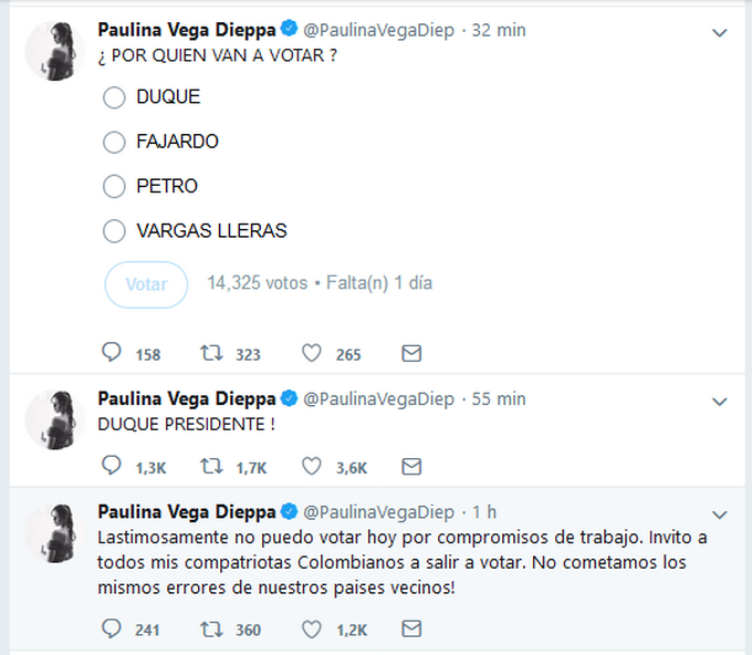 La ex miss Universo colombiana Paulina Vega cerró hoy su cuenta en la red social de Twitter tras recibir constantes críticas por apoyar al candidato uribista a la Presidencia de Colombia, Iván Duque.