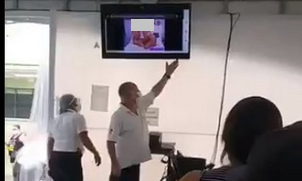 A través de redes sociales mostraron el bochornoso momento en que el que las personas que estaban en la sala de espera tuvieron que ver la proyección del video porno entre dos mujeres.