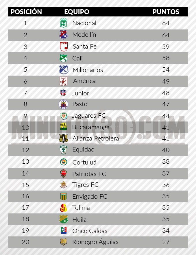 Al frente de la tabla se ubica Atlético Nacional, con 84 puntos; el DIM es segundo, con 64; mientras que el ‘Expreso Rojo’ es tercero, con 59.