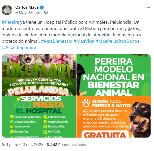 Por su parte, el alcalde de Pereira, Carlos Maya, manifestó que para asegurar los recursos del hospital público veterinario, así como el sisbén para los perros y gatos de las familias más vulnerables de la ciudad, el 1 de noviembre se va a presentar ante el Concejo de Pereira, un proyecto de acuerdo de política pública de bienestar animal.