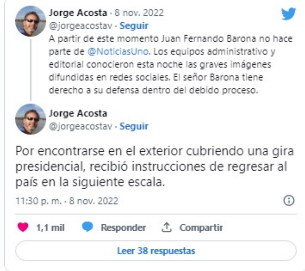 Además, el periodista fue despedido de ‘Noticias Uno’ y retirado del grupo de los periodistas que cubren al presidente Gustavo Petro en la Conferencia de las Naciones Unidas sobre el Cambio Climático (COP27), que se lleva a cabo en Egipto.