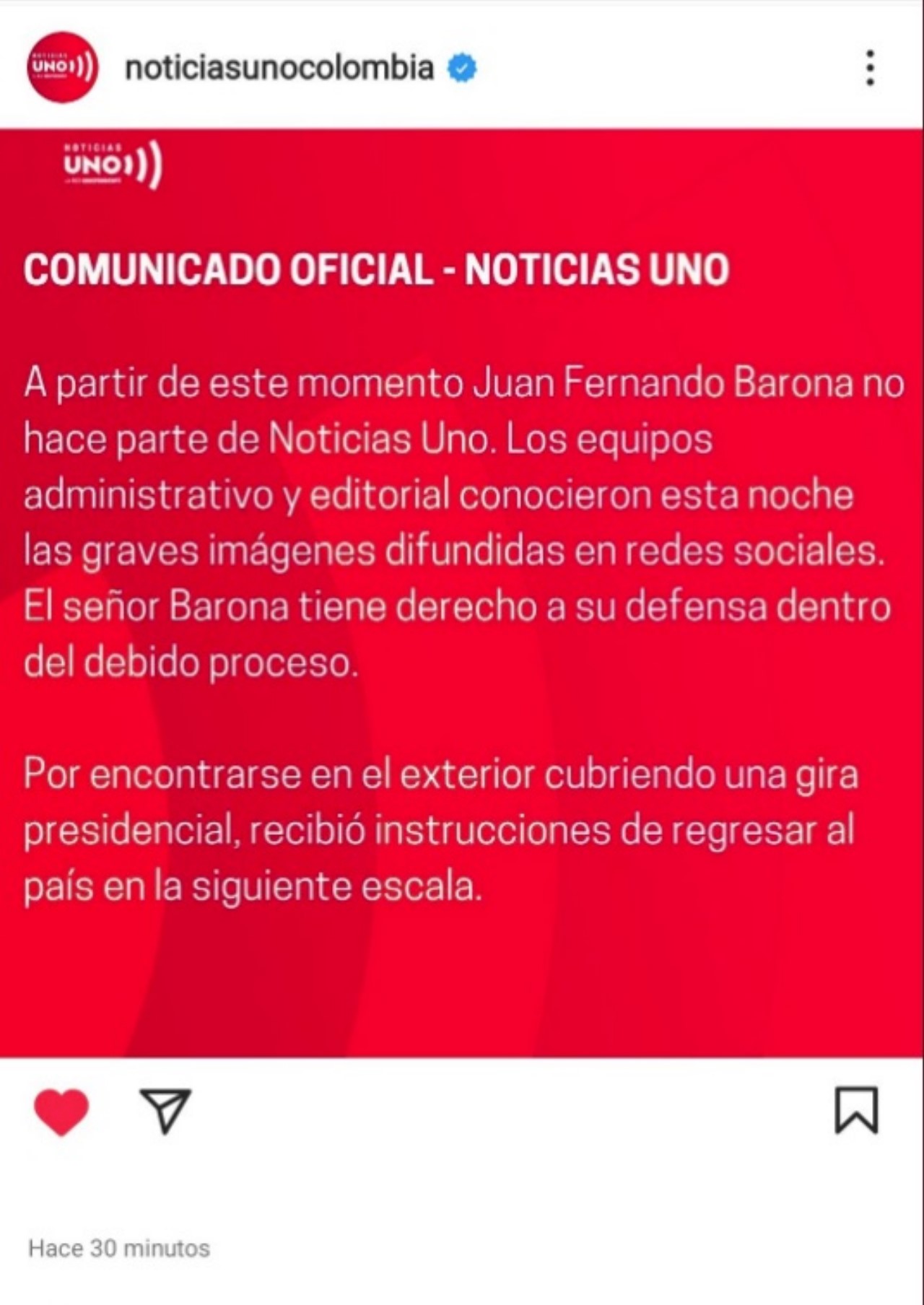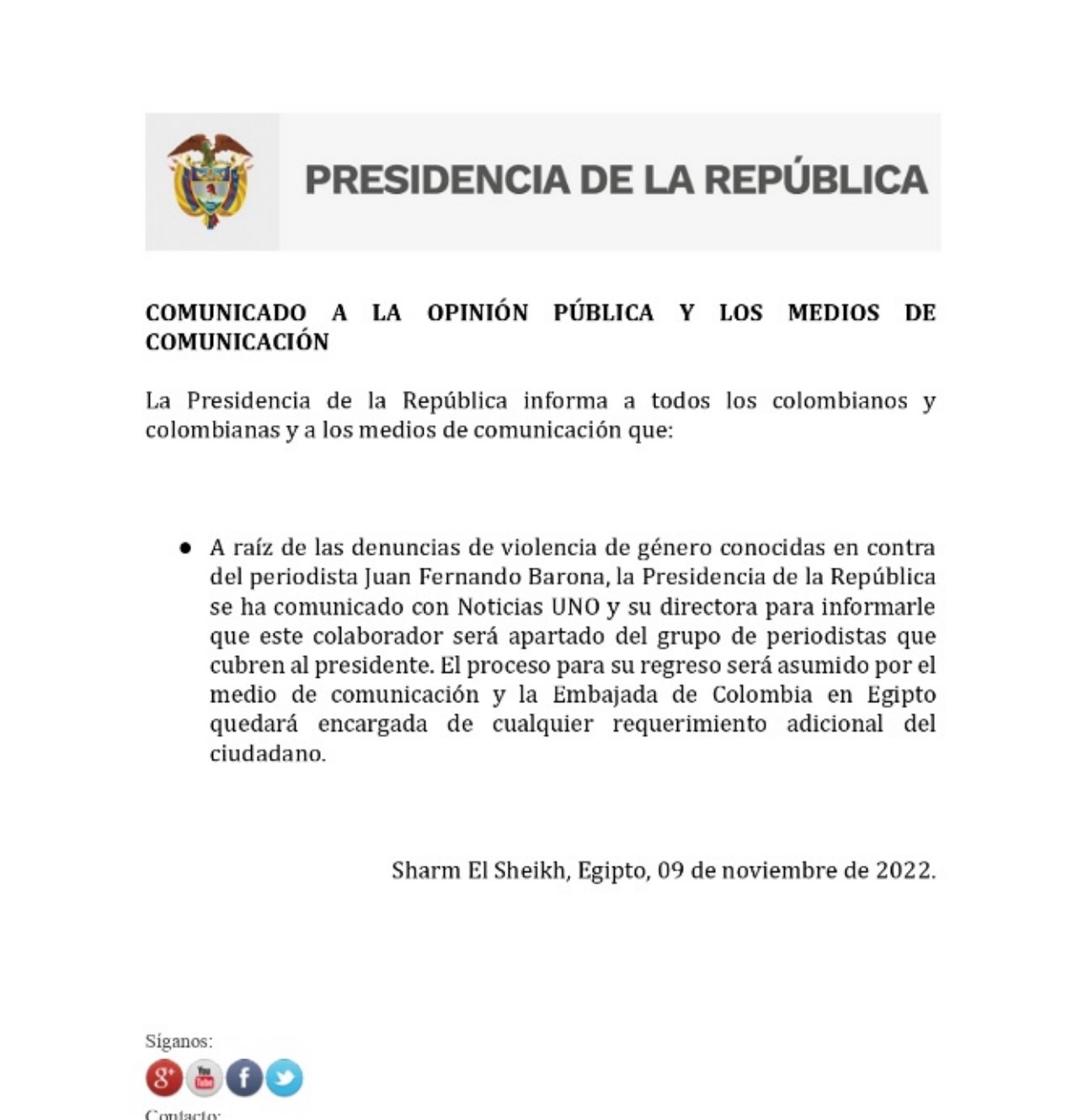 La Presidencia de la República informó por medio de un comunicado: “A raíz de las denuncias de violencia de género conocidas en contra del periodista Juan Fernando Barona, la Presidencia de la República se ha comunicado con Noticias UNO y su directora para informarle que este colaborador será apartado del grupo de periodistas que cubren al presidente. El proceso para su regreso será asumido por el medio de comunicación y la Embajada de Colombia en Egipto quedará encargada de cualquier requerimiento adicional del ciudadano”.