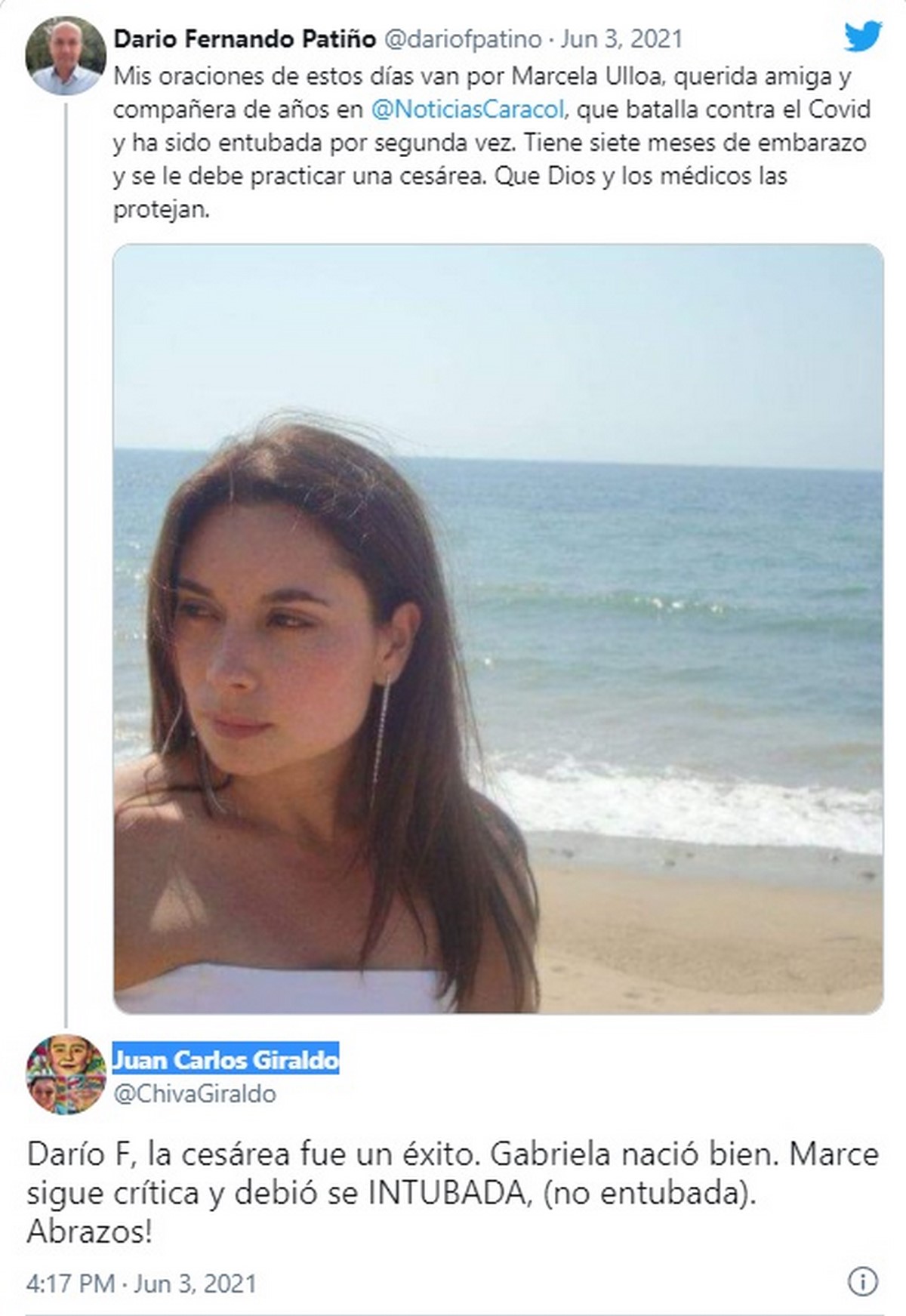Patiño publicó una foto de la periodista, y escribió: “mis oraciones de estos días van por Marcela Ulloa, querida amiga y compañera de años en Noticias Caracol, que batalla contra el Covid y ha sido intubada por segunda vez. Tiene siete meses de embarazo y se le debe practicar una cesárea. Que Dios y los médicos las protejan”.