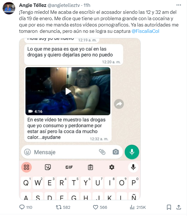 “¡Tengo miedo! Me acaba de escribir el acosador siendo las 12 y 32 am del día 19 de enero. Me dice que tiene un problema grande con la cocaína y que por eso me manda estos vídeos pornográficos. Ya las autoridades me tomaron denuncia, pero aún no se logra su captura @FiscaliaCol”, fue el mas reciente mensaje de la víctima en su cuenta de X.