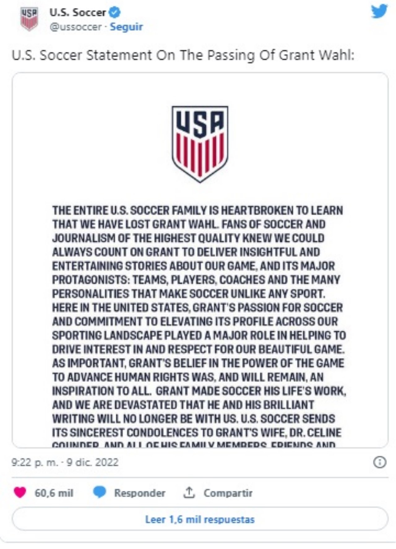 Por medio de su cuenta de Twitter, la Federación de Fútbol estadounidense publicó un comunicado: “Grant hizo del fútbol el trabajo de su vida, y estamos devastados porque él y su brillante escritura ya no estarán con nosotros”.