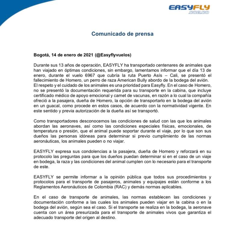 en Instagram @mafe_echeverry18 denunció la muerte de su perro. “Homerito falleció ayer en la aerolínea Easyfly” “Compré el tiquete aclarando que viajaba única y exclusivamente con mi perrito”, pero “en el aeropuerto me manifiestan que no puedo viajar con él“ Homero lo asesinaron pic.twitter.com/nZ7NNC156v