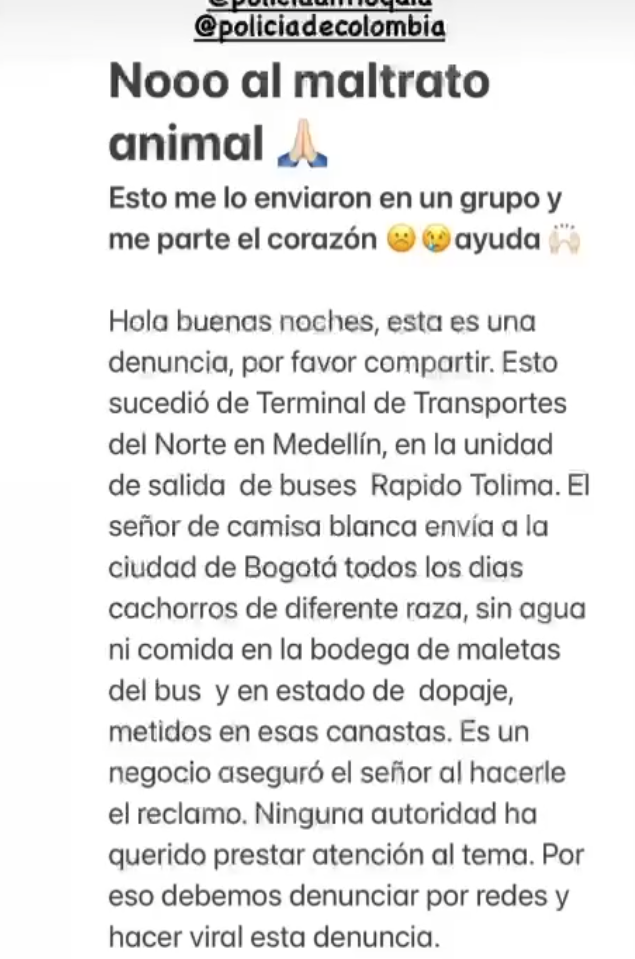Al dar a conocer el hecho que se habría registrado el domingo de pascua anterior, un cibernauta escribió en las redes sociales, “el señor de camisa blanca envía a la ciudad de Bogotá todos los días, cachorros de diferentes raza sin agua, ni comida en la bodega de moletas del bus y en estado de dopaje metidos en esas canastas. ‘es un negocio’, aseguró el señor al hacerle el reclamo”.