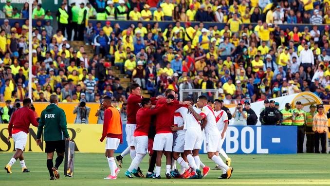 Jugadores de Perú celebran al final del juego ante Ecuador durante un partido por las eliminatorias al Mundial de Rusia 2018 disputado en el Estadio Olímpico Atahualpa de Quito (Ecuador). EFE