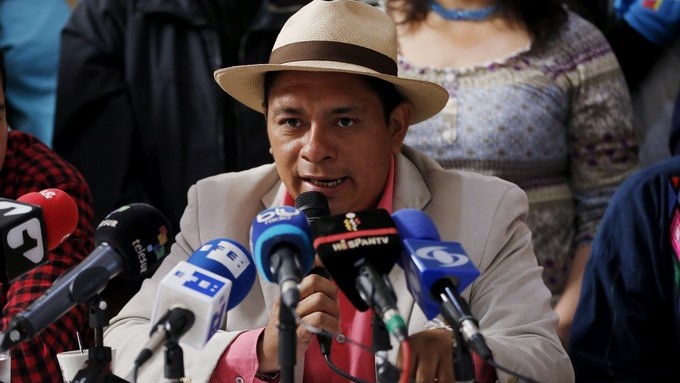 El consejero mayor de la Organización Nacional Indígena de Colombia (ONIC), Luis Fernando Arias (c), habla en rueda de prensa este lunes, en Bogotá (Colombia). EFE
