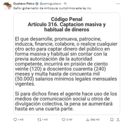 A través de su cuenta de X, el Jefe de Estado compartió el Artículo 316 del Código Penal que habla sobre Captación masiva y habitual de dineros.