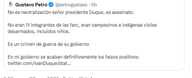 En su cuenta en Twitter, Petro escribió, “no es neutralización señor presidente Duque, es asesinato. No eran 11 integrantes de las Farc, eran campesinos e indígenas civiles desarmados, incluidos niños. Es un crimen de guerra de su gobierno”.