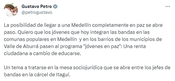 “La posibilidad de llegar a una Medellín completamente en paz se abre paso. Quiero que los jóvenes que hoy integran las bandas en las comunas populares en Medellín y en los barrios de los municipios de Valle de Aburrá, pasen al programa jóvenes en paz, una renta ciudadana a cambio de educarse. Un tema a tratarse en la mesa socio jurídica que se abre entre los jefes de bandas en la cárcel de Itagüí.”
