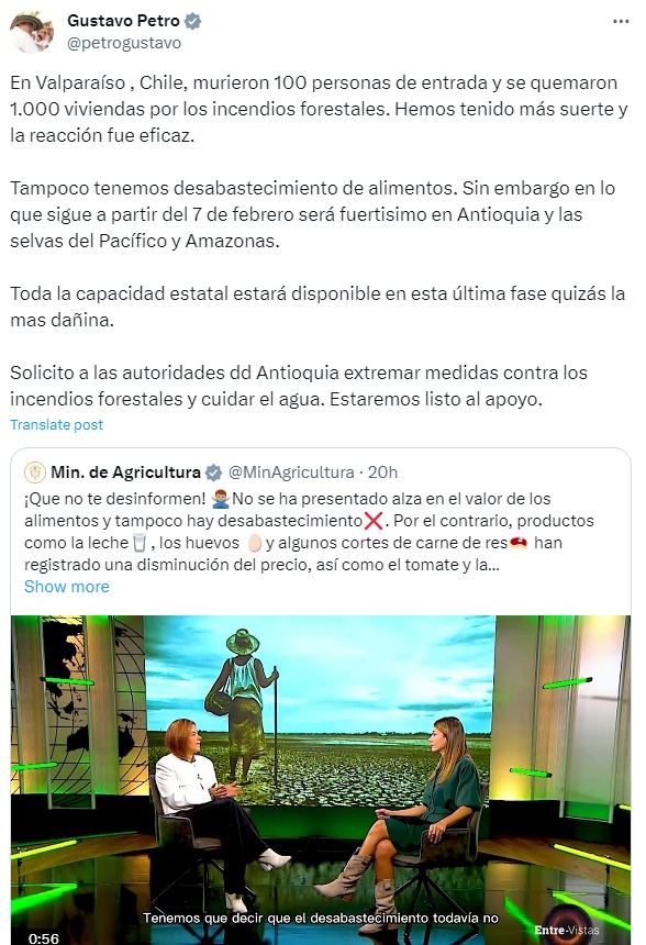 A través de su cuenta de X, el presidente Gustavo Petro lanzó una alerta sobre los últimos días del fenómeno de El Niño y solicitó a las autoridades del departamento de Antioquia “extremar medidas” contra los incendios forestales y cuidar el agua.