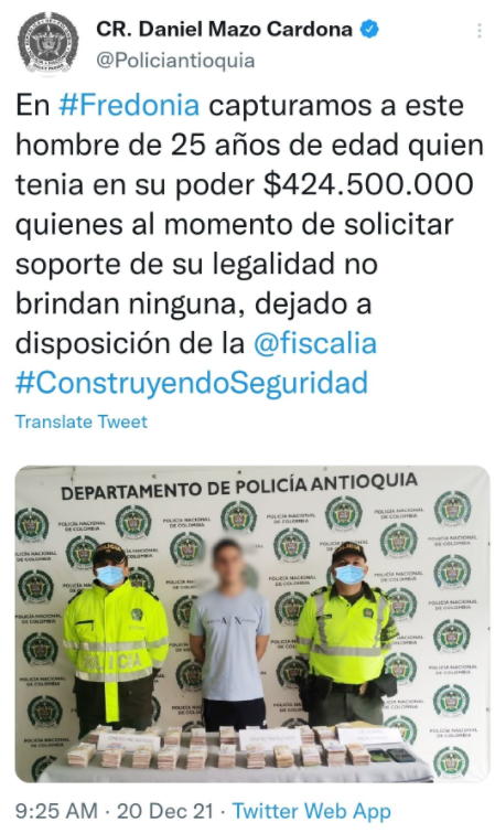 En Twitter, la Policía de Antioquia dio a conocer la captura de un sujeto en Fredonia que andaba con una millonada encima y sin justificarlos por lo que fue capturado; no obstante, los cibernautas, en lo que menos se fijaron fue en la captura pero si en la fotografía para reseñar al sujeto.