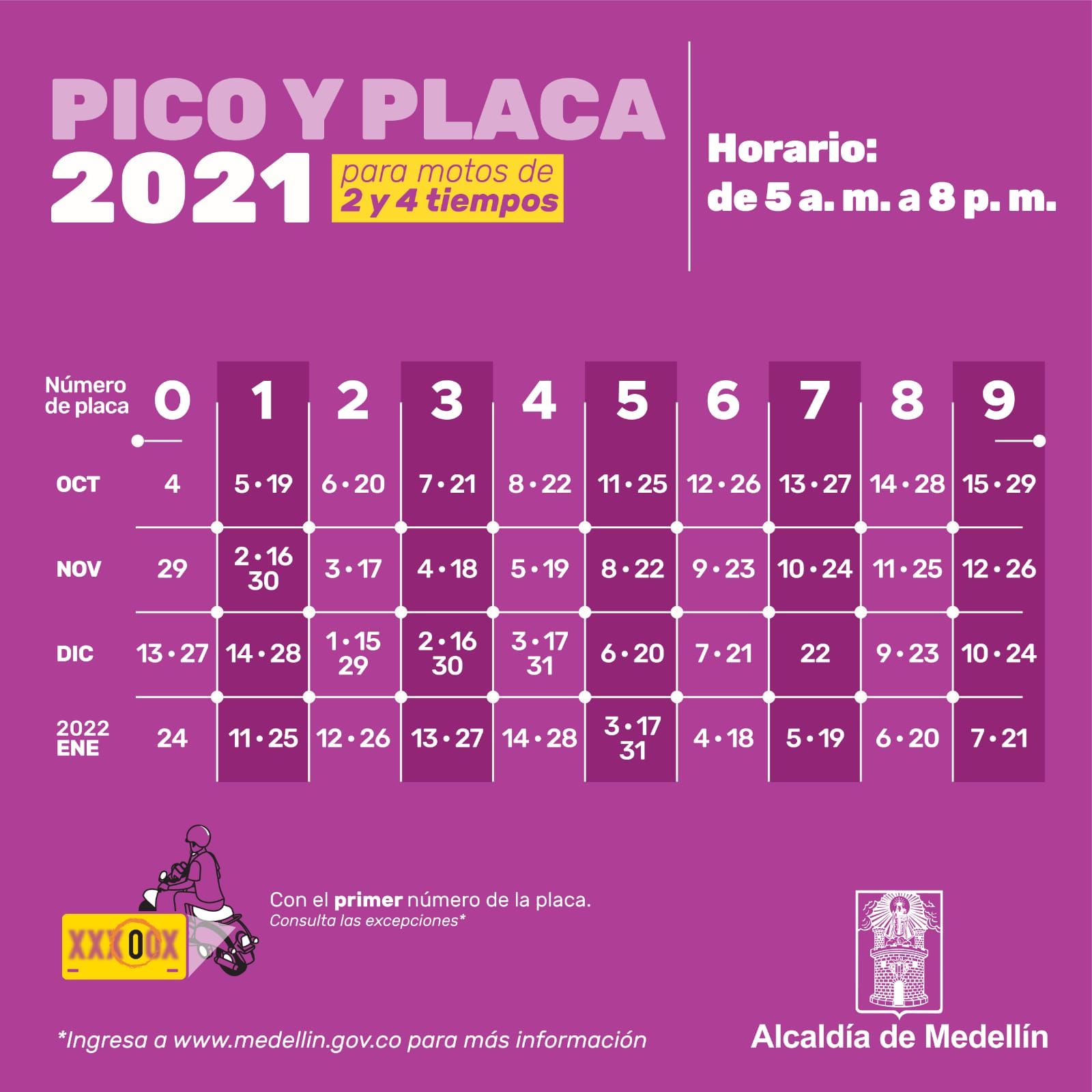 “El pico y placa para motocicletas también será de un dígito al día, es decir que cada vehículo tendrá restricción cada dos semanas. Aplicará de lunes a viernes entre las 5:00 a. m. y las 8:00 p. m. Es importante recordar que la rotación para las motos se determina de acuerdo con el primer dígito de la placa”, dijo el secretario de Movilidad, Carlos Mario Mejía.