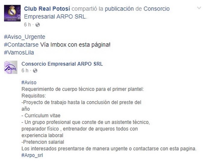 El Club Real Potosí de Bolivia, sorprendió a todos publicando en su cuenta de Facebook, que necesitaban con urgencia un nuevo DT.