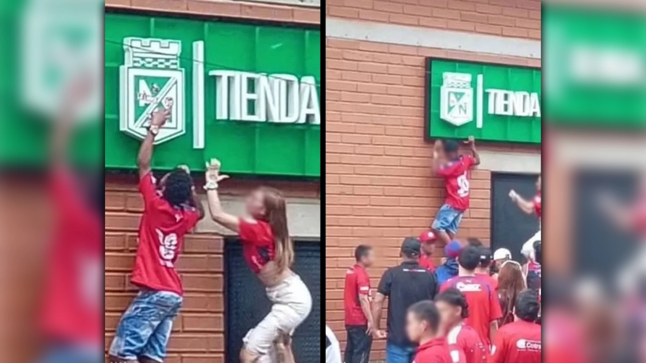Hombres y mujeres, vestidos con camisetas del DIM vandalizaron la tienda verde de su rival de patio Atlético Nacional.
