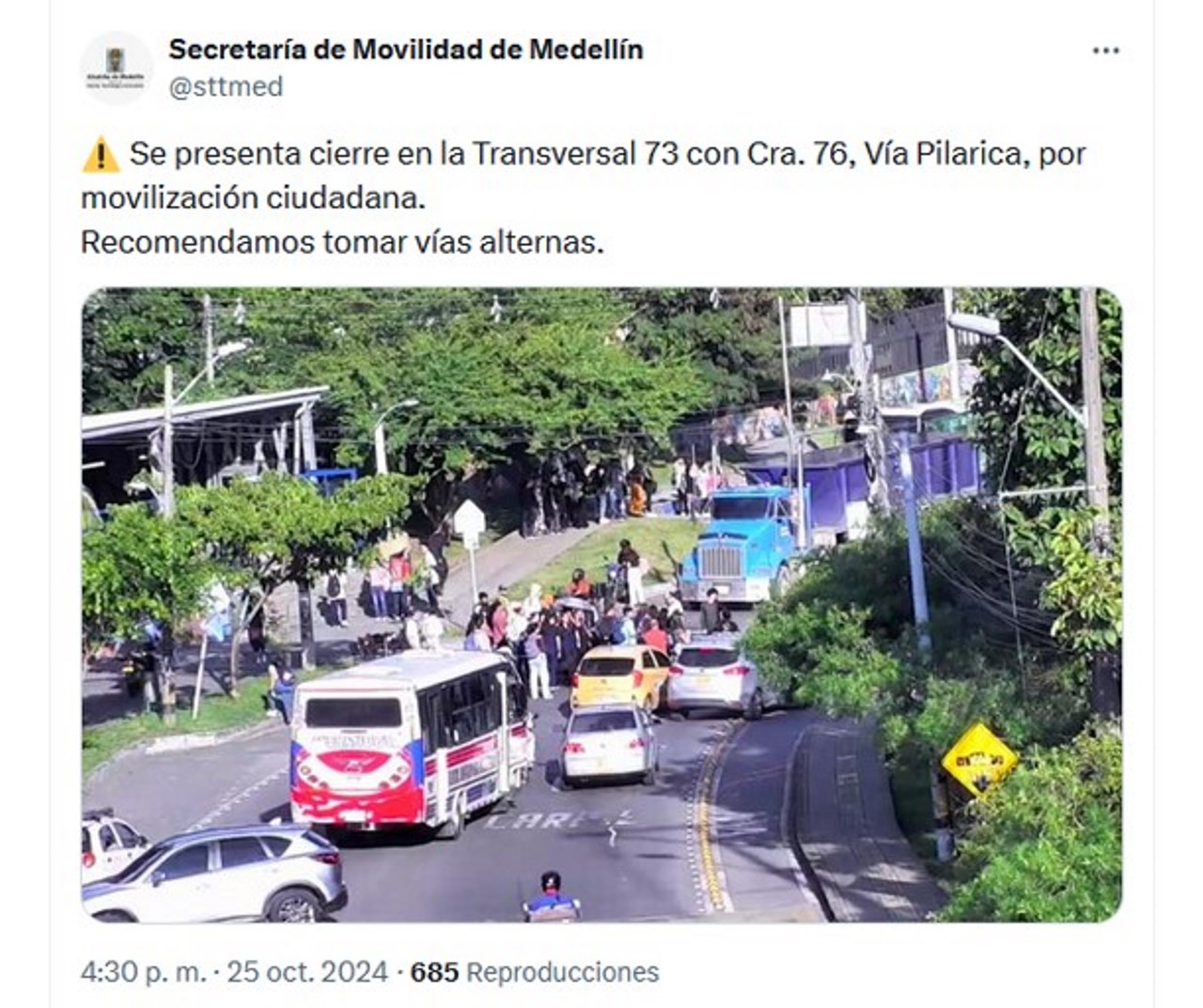 Minuto30.com .- La Secretaría de Movilidad de Medellín reporta cierre en la Transversal 73 con Carrera 76, en la vía a Pilarica, debido a movilización ciudadana.