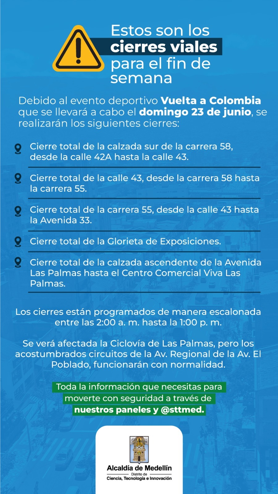 Por la llegada de los ciclistas, la Alcaldía de Medellín anunció los cierres viales que se registrarán por el paso de los corredores.