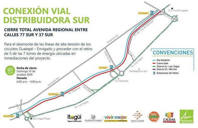 Entre las 6:00 a.m. y 6:00 p.m. del domingo 13 de octubre se realizará el cierre total de la Avenida Regional, entre las calles 77 sur (Sabaneta) y 37 sur (Envigado), para permitir el desmonte de las líneas de alta tensión de los circuitos Guatapé – Envigado, Envigado – Guatapé, con el fin de retirar 5 de las 7 torres de energía ubicadas en inmediaciones de las obras de ampliación de la Conexión Vial Distribuidora Sur.