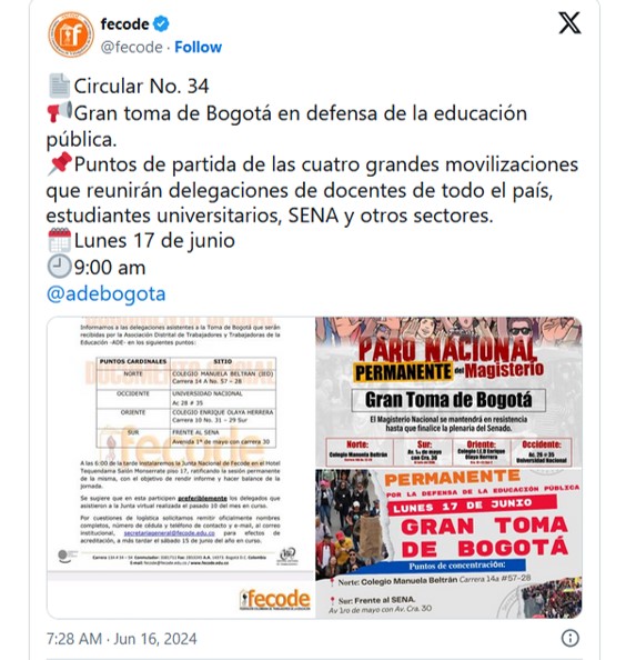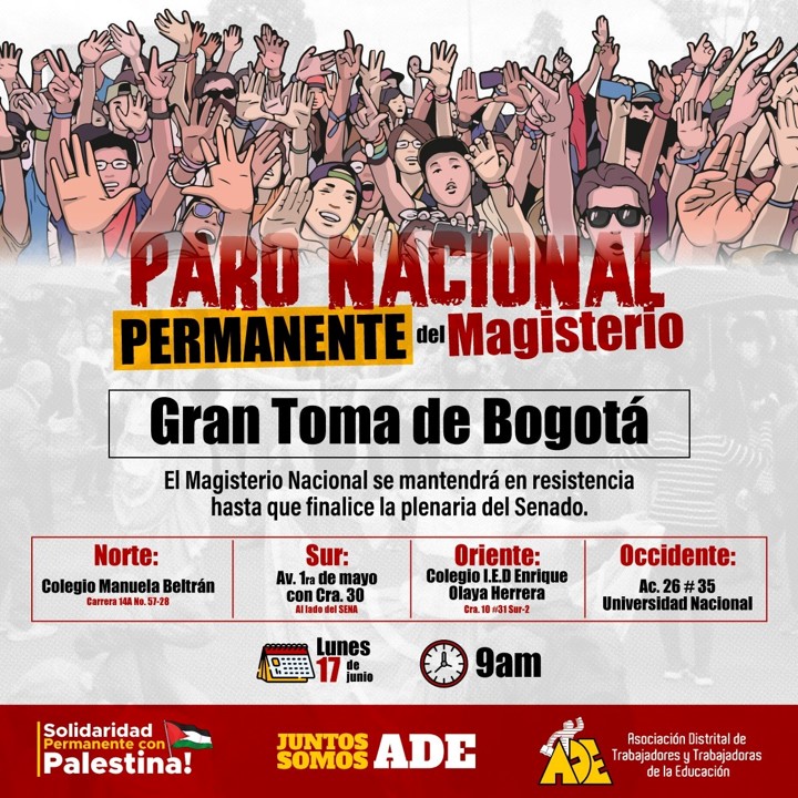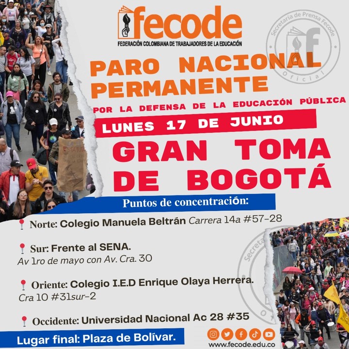 Minuto30.com .- Este lunes 17 de junio se espera la llamada “Gran toma de Bogotá” por parte de los maestros de FECODE, en llamado hecho por las directivas de la Federación.