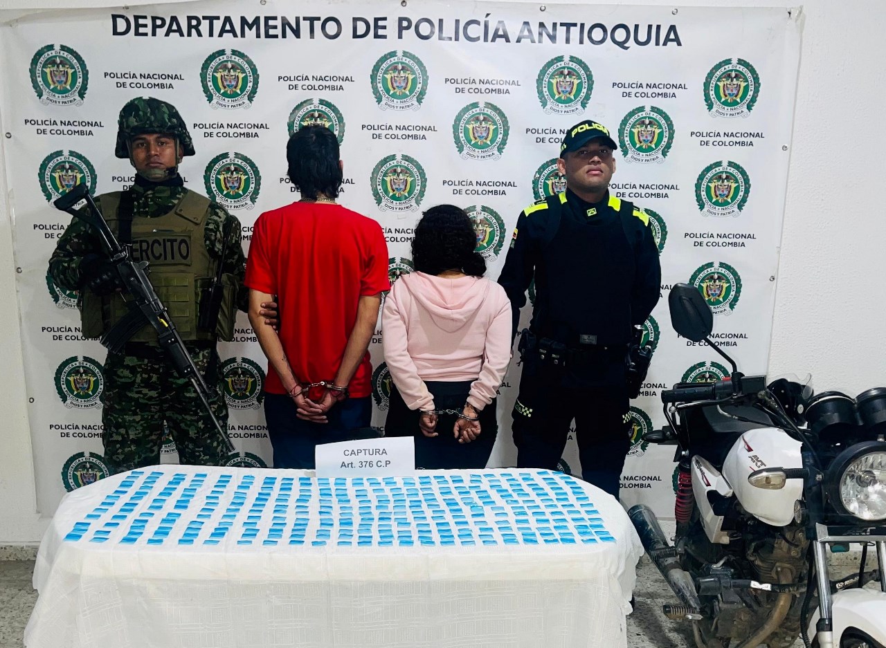 Minuto30.com .- En un operativo conjunto entre la Policía Nacional y el Ejército, durante labores de registro y control, fueron capturados un hombre de 20 años y una mujer de 22 años, quienes se movilizaban en una motocicleta por una de las vías de Abejorral.