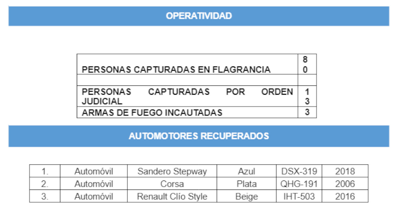 Asimismo, dieron a conocer que lograron la captura de 80 personas capturadas en flagrancia y 13 más por orden judicial.