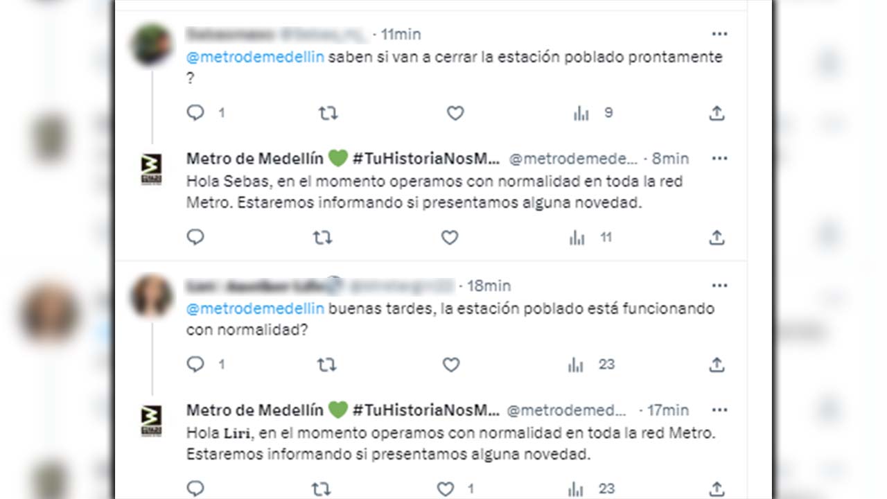 Por medio de la red social ´X´, conocida como Twitter, usuarios del Metro preguntaron si estaba funcionando con normalidad la estación Poblado luego de que se presentaran disturbios en cercanías del INEM y Monterrey.